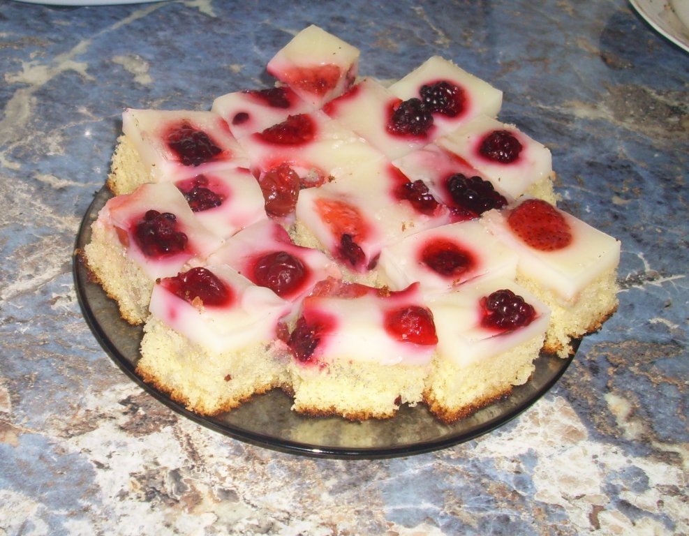 Se face un blat din oua, faina, zahar, ulei, praf de copt, zahar vanilat si esenta de vanilie care se coace 20 min. Cand s-a racit se insiropeaza cu un sirop din apa, zahar si esenta de vanilie. Apoi se face budinca conform instructiunilor de pe ambalaj,dar se pun doar 750 ml lapte (pt ambele plicuri). Se taie fructele si jumatate din ele se pun pe blat, se toarna budinca (calda) iar peste se pun restul de fructe. Apoi se face gelatina si se toarna peste fructe.