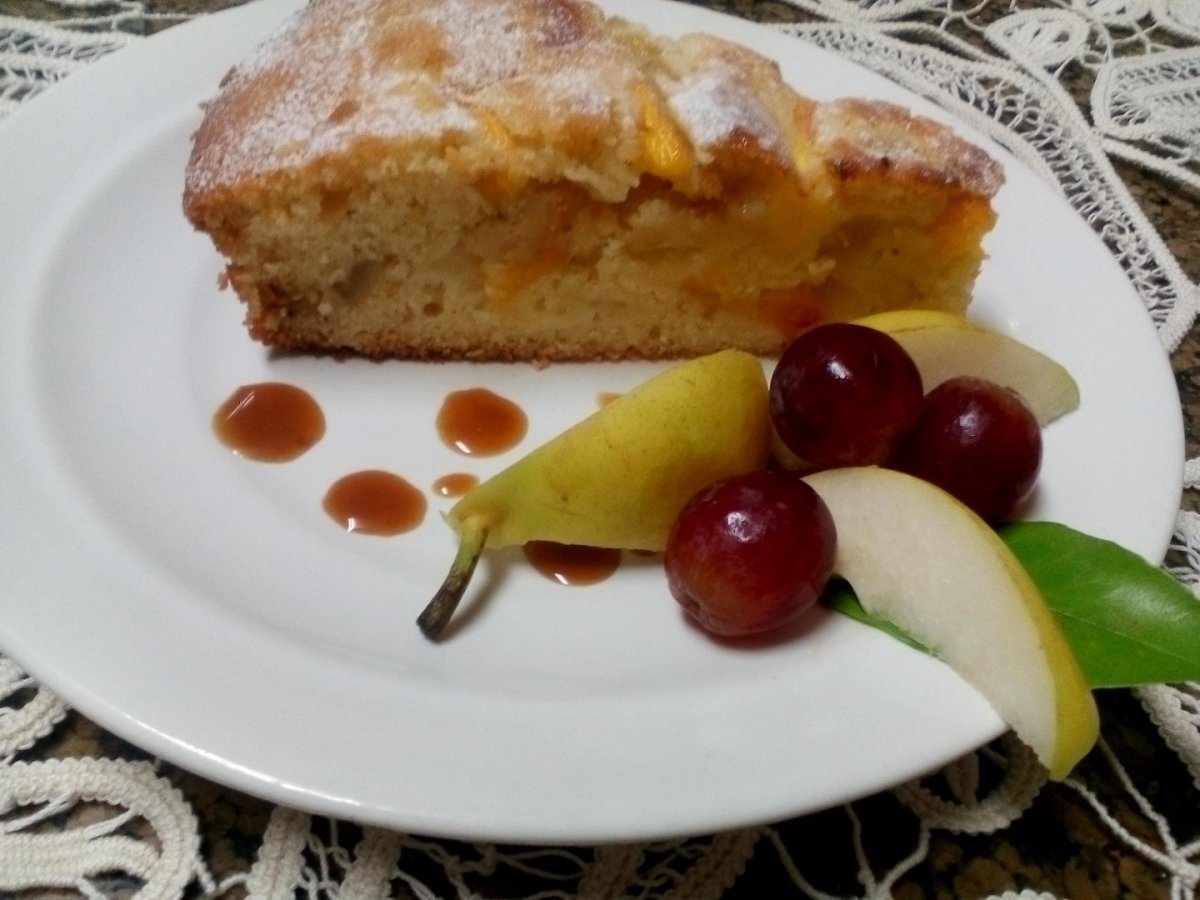 Spalam fructele si le curatam de coaja, apoi le taiem fie in cuburi, fie felii nu prea groase. Boabele de struguri, dupa ce le-am spalat, le taiem in jumatate si le vom scoate simburii. Punem jumatate din compozitie de aluat, dupa care vom presara jumatate din cantitatea de fructe pe toata suprafata vasului, apoi restul de compozitie si cantitatea de fructe ramasa, pe care o aranjam in stil geometric pe toata suprafata. Daca urmariti si imaginile postate veti vedea cum am aranjat fructele in primul si ultimul strat. Vom porni cuptorul la 180 grade apoi introducem prajitura si o vom lasa la copt cca.40 de minute, dar inainte de a o scoate vom face testul cu scobitoarea. Dupa ce s-a copt o vom lasa sa se raceasca, apoi o rasturnam pe un platou si o pudram cu zahar.