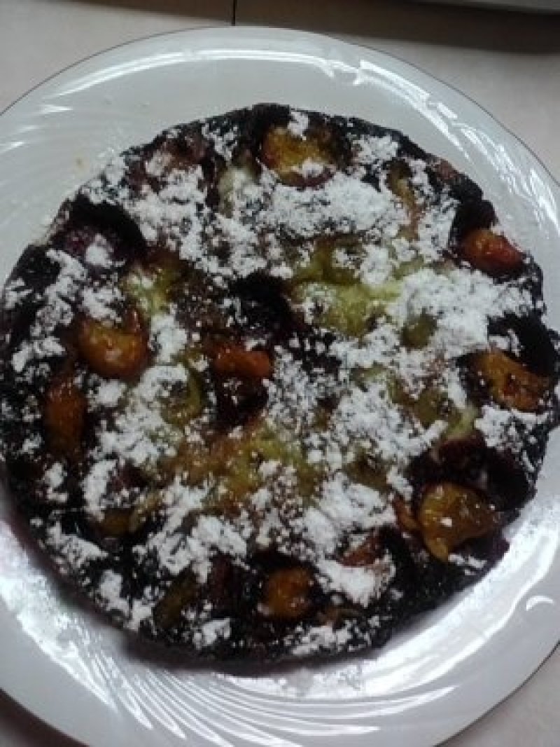 Ungi dubletta cu unt, presari cu zahar si zahar vanilat, asezi fructele, dai pe flacara pentru 2 minute, dupa care rastorni compozitia pentru blat peste fructele usor incalzite. Acoperi tigaia, dai pe flacara pentru 4-5 minute, rastorni tarta pe un platou, presari cu zahar pudra vanilat. Tai felii dupa ce se raceste.