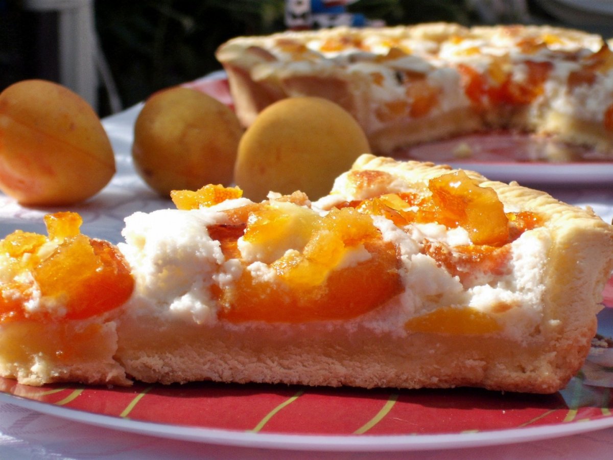 2.Amestecam smantana cu jumatatate din zaharul pudra si ghimbirul ras,adaugam si branzica de vaci din care oprim 2 linguri.Mixam albusurile cu restul de zahar apoi incorporam cu grija in amestecul de smantana.Turnam totul peste aluatul din forma apoi deasupra asezam jumatati de caisa,cu scobitura in sus.In scobiturile caiselor adaugam cate un pic de branzica si cateva cubulete de coaja de portocala confiata.Dam la cuptor cca.30 minute.