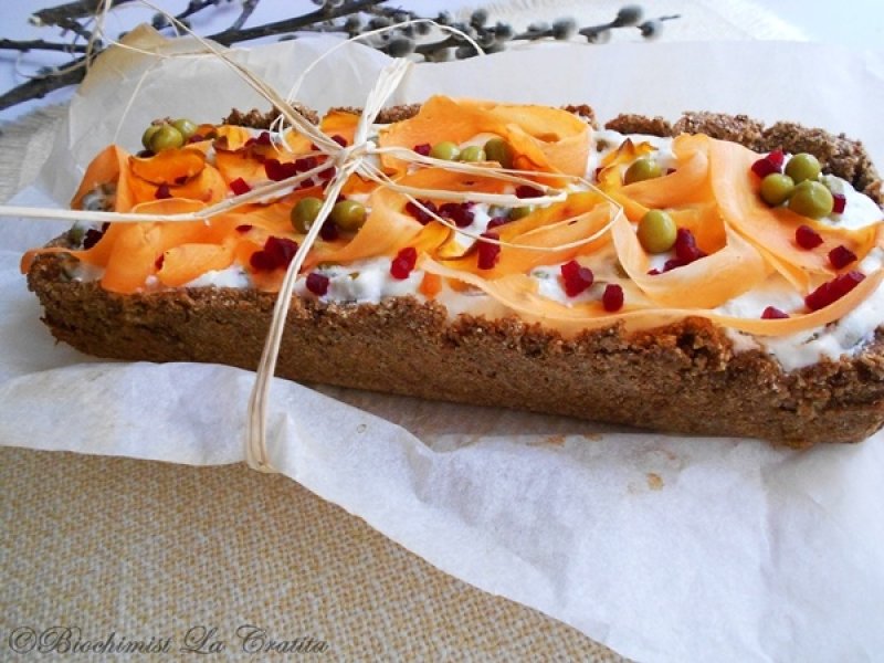 6. Morcovul curatat il feliem cu ajutorul unui curatator de legume, sfecla o taiem felii apoi decupam cerculete mici cu ajutorul unui pai de suc. Le punem deasupra tartei dupa ce o scoatem din cuptor.