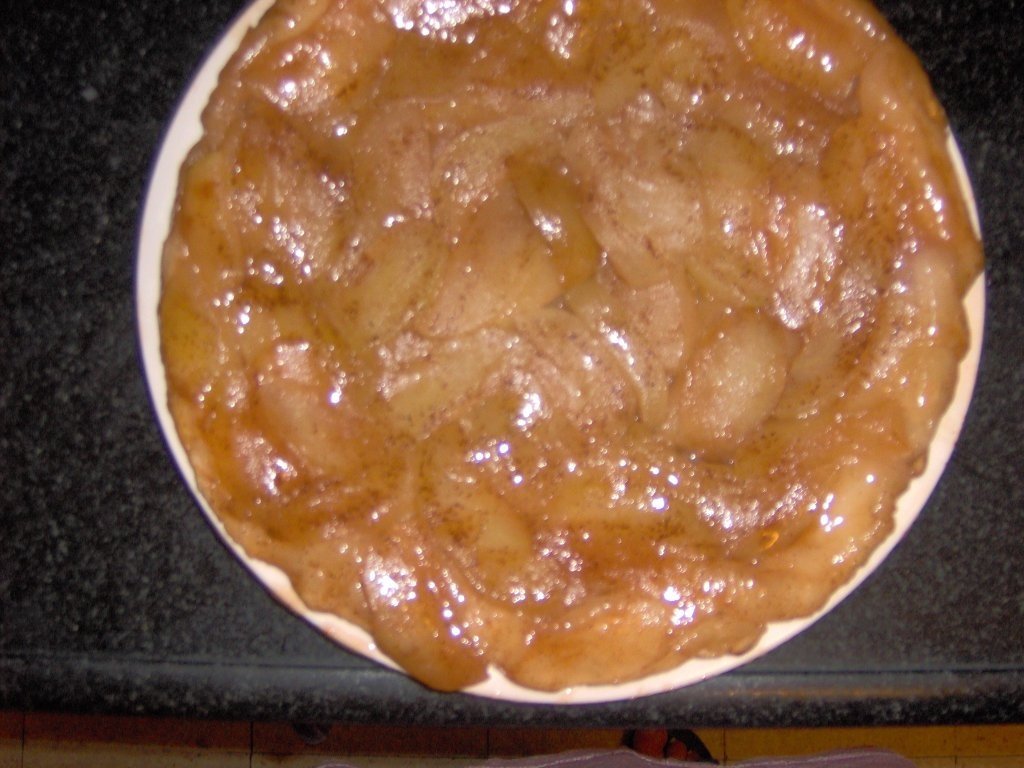 Se coace tarta in cuptor incalzit dinainte la 180 de grade pina se rumeneste frumos.Lasam sa se raceasca putin punem un platou peste tigaie si rasturnam tarta pe platou.Se poate presa inca putin zahar pudra deasupra .