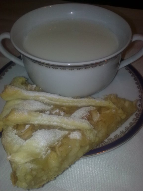 Merele rase se călesc la foc mediu, adaug zahărul iar spre sfârşit pun scorţişoara. Se unge tava cu puţin unt sau ulei, eu nu am uns-o. Pun aluatul decongelat în tavă, tai marginile prea lungi şi adaug merele. Din aluatul rămas decupez fâşii pe care le pun deasupra în formă de grilaj. Se coace până devine aurie. La sfârşit se poate pudra cu zahăr vanilinat. Puteţi încerca şi cu pere sau bostan.