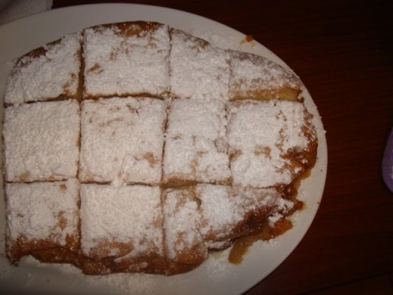 Cand sunt gata merele,se toarna compozitia peste ele si se mai da la cuptor in 30-40 minute.Cand este gata,se pudreaza.