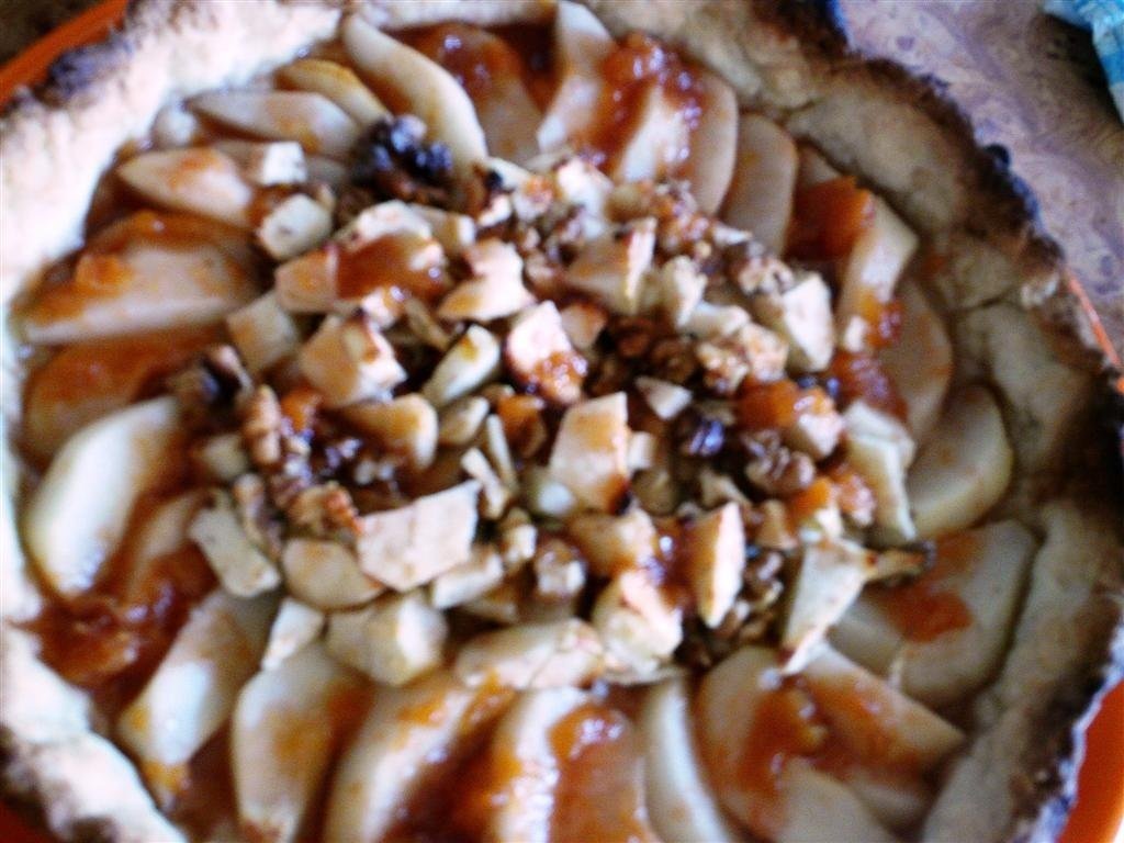 Între timp se curata 4 pere si se taie pe lungime . Din aluatul răcit se intinde o foaie într-o tavă rotundă de tarte, cu diametrul de 23cm. Pe marginea aluatului din tavă se aseaza un rând de felii de pere suprapuse puţin, în aşa fel încât mijlocul să rămână liber. Se taie merele în cubuleţe şi se amesteca cu nucile zdrobite şi cu 1 lingură zahăr tos. Acest amestec se pune in mijlocul tartei. Se coace la foc potrivit cam 30 de minute . Dupa ce se coace, se amesteca 2 linguri de gem de caise cu putin coniac (eu am pus visinata pentru ca nu am avut coniac) si se pune pe deasupra tartei fierbinti.