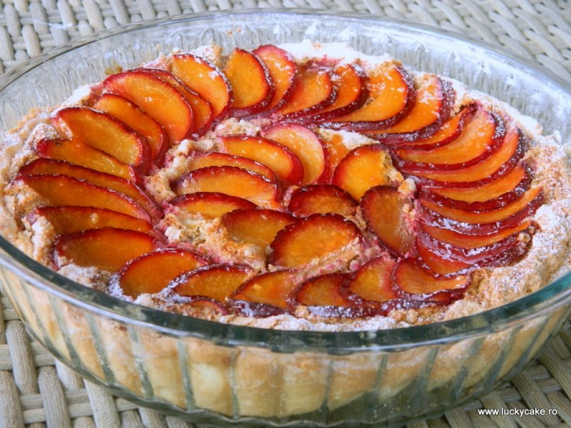 Punem umplutura peste aluat, iar peste asezam prunele taiate felii subtiri (prunele care le-am avut au fost mai acrisoare ) si presaram putin zahar pudra. Dam la cuptor la 180 grade timp de 30 -35 minute. Dupa ce o scoatem din cuptor ungem prunele cu gemul de caise si o lasam sa se raceasca apoi o servim.