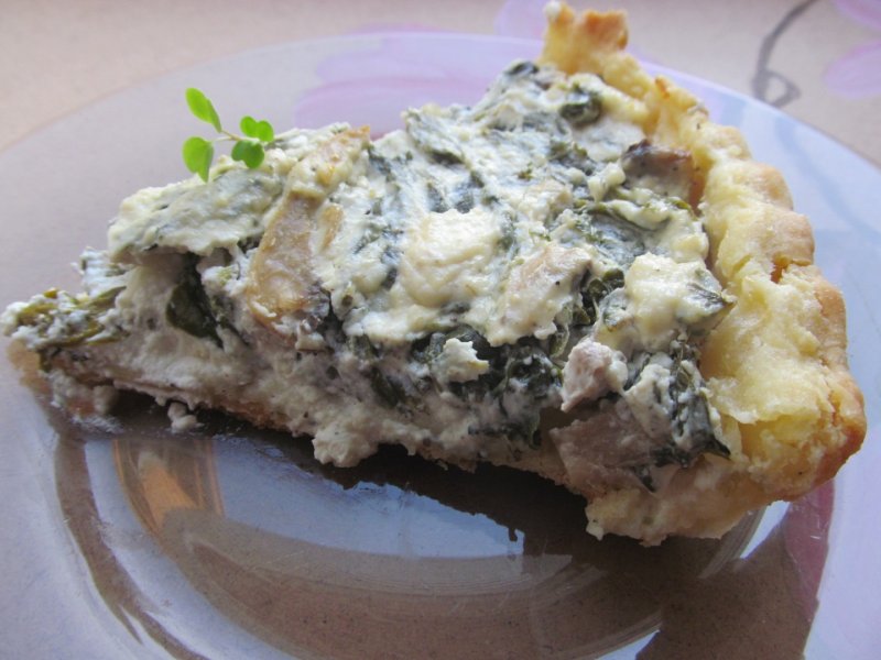 Separat amestecăm brânzeturile cu sare, piper, nucșoară. Peste acestea, vom turna spanacul și ciupercile.