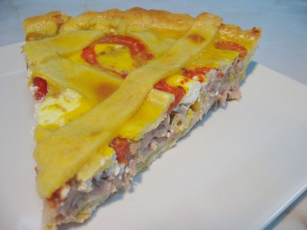 În aluatul de tartă puneţi, cu lingura, amestecul de ton cu porumb, apoi împrăştiaţi deasupra nişte brânză feta şi roşiile tăiate rondele subţiri.