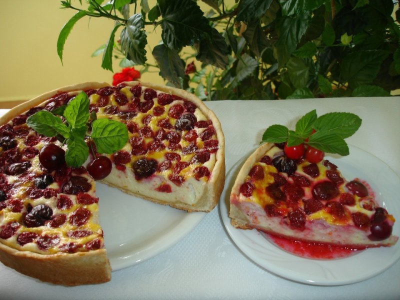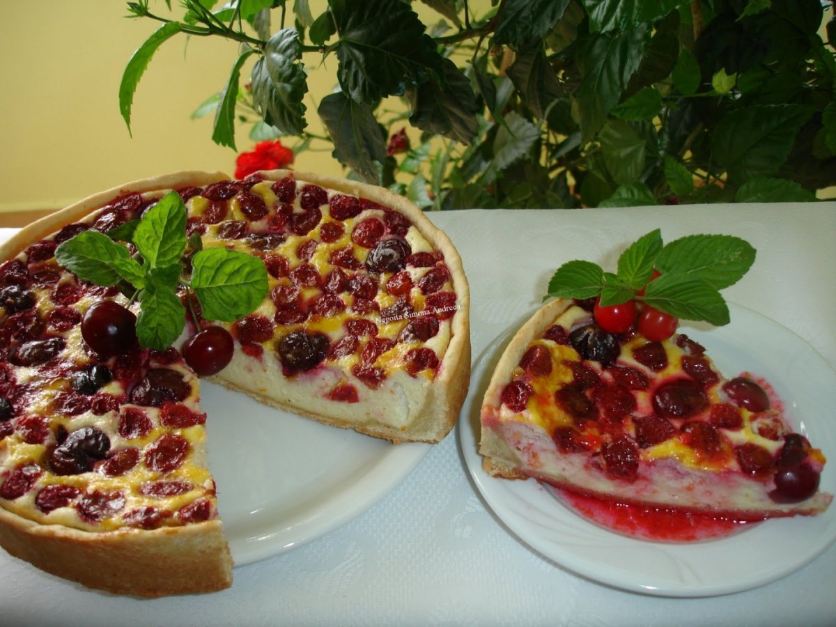 Amestecam faina cu praful de copt apoi adaugam amidonul, oul, zaharul, untul topit si incorporam cu mana. Se formeaza un aluat destul de fraged pe care il punem intr-o folie si il dam la frigider pentru cel putin ½ ora. Pentru umplutura amestecam untul topit cu zaharul, esentele, coaja de portocale, galbenusurile, amidonul si branza. Eu le amestec cu lingura sau mana caci la mixer mi se pare ca iese crema prea fina totusi dar o puteti face cum doriti. Albusurile se bat spuma cu zeama de lamaie si un praf de sare. Se incorporeaza apoi albusurile amestecand usor de jos in sus. Visinelor li se scot samburii si se pune peste ele 1 pahar de zahar sa-si lase zeama dupa care se pun la scurs. Tapetam apoi o forma de tort cu hartie pentru copt. Se opreste 1 sfert din aluat si din restul se intinde un aluat de dimensiunea formei. Se pune forma de tort pe aluat si se taie un cerc de dimensiunea ei. Se pune in forma dupa care se face din aluatul oprit un snur care se pune peste cerc. Cu ajutorul degetelor se apasa aluatul ca sa se aseze si sa urce usor pe margini formand o margine a tartei. Se pune compozitia de branza, se aseaza visinele care au fost scurse bine si se da la cuptorul incins pentru 1 ora si 20 de minute. Dupa 40-50 de minute se unge tarta cu un galbenus de ou batut pentru aspect si se lasa in continuare la cuptor. Puneti tarta la foc mic pentru a nu se arde si de preferat a respecta timpul de coacere. Se serveste rece cu sirop de la visinele scurse.