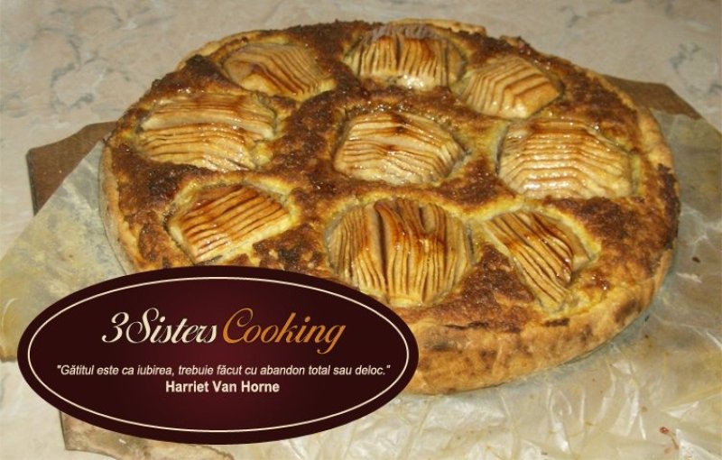 5. Curatati de coaja celelalte 4 mere, taiati-le in jumatati si scoateti miezul. Crestati fin si des suprafat bombata a jumatatilor si asezati-le in forma de floare in tava peste spuma. Puneti tarta in cuptor si o coaceti timp de 40 de minute.