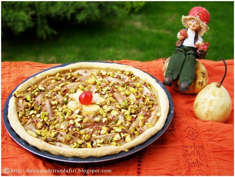 Scoti aluatul din frigider, il intinzi pe blatul de lucru pudrat cu faina, il rulezi pe facalet si il derulezi peste forma de tarta. Adaugi piureul, restul de 5 pere le tai felii si le asezi deasupra. Pui tarta la cuptor 30-35 min. iar cand o scoti, presari si fisticul tocat. Servesti rece, eventual cu inghetata alaturi. Pofta buna!