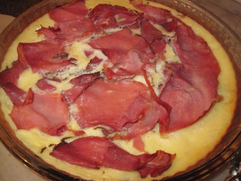 Daca vi se pare ca sa rumeneste si se usuca prea tare feliile de prosciuto, se mai acopera cu folia de staniol si se lasa pana aluatul capata consistenta. Se face testul cu scobitoarea. Pofta buna!