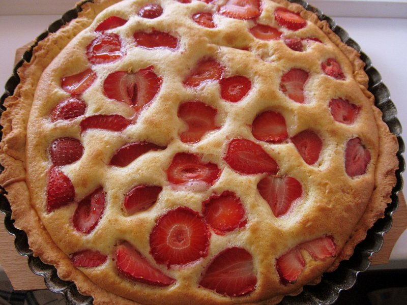 Adăugăm căpșunile, iar tarta va fi gata de copt încă 15-20 de minute.