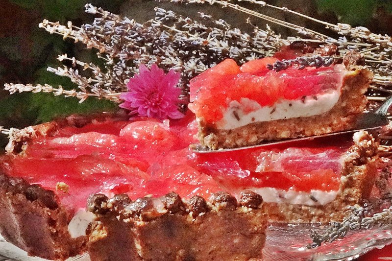 Intre timp curatam de coaja si pielita grapefruitul, apoi se feliaza. Cu aceste feliute de grapefruit curatate de pielita (trebuie indepartata pentru ca este amara), se decoreaza tarta, presand usor feliutele de fructe in umplutura de branzica. Se da la rece o ora, apoi se scoate si se toarna gelatina calda pe care am pregatit-o amestecand in continuu in siropul amestecat cu praful de jeleu, pana da intr-un clocot si devine transparenta. Se mai lasa cca. 30 minute la rece, apoi se poate scoate din forma si portiona.E ste o tarta racoroasa, parfumata si o sa fie adorata de toti cei ce vor servi din ea!