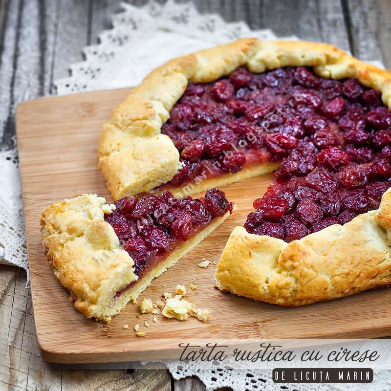 4. Punem peste pesmet gramajoare din amestecul de cirese, apoi ridicam marginea aluatului pentru a nu se scurge continutul de fructe. Lasam mijlocul neacoperit. Ungem aluatul cu ou batut si coacem tarta in cuptorul preincalzit la foc mediu, aproximativ 25-30 de minute, pana ce aluatul se rumeneste frumos.