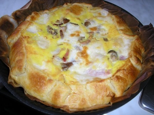 Taiem ciupercile in felii si le sotam intr-o tigaie cu ulei si catelul de usturoi. Sotam pana cand au lasat toata apa. Ungem o tava, intindem aluatul si asezam feliile de cascaval, feliile de sunca presata, ciupercile si deasupra branza topita. Amestecam ouale batute cu parmezanul, sare si piper, dupa care il rasturnam in tava peste amestecul nostru. Inchidem cu pasta care ramane in afara si bagam la cuptor ptr 40 de minute la 180°C. Se poate servi cu o salata de rosii. Pofta buna!