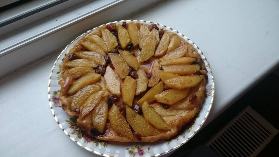 Merele si stafidele se pun in tava peste caramel și deasupra lor se asază ușor aluatul.
