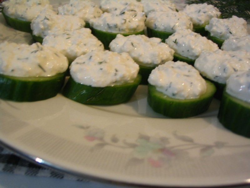 Branza se amesteca cu smantana si mararul tocatu, praful de sare si se pune cu linguritza pe feliutzele de castravete .
