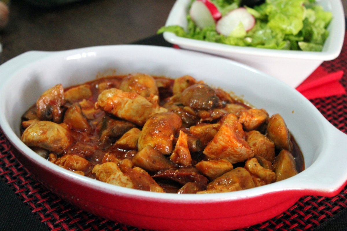 Daca nu, dizolvam cele 3 lg bulion intr-o cana cu apa si turnam peste pui si ciuperci. Dam un pic la foc iute, mai adaugam o cana cu apa si lasam sa fiarba inca vreo 15 min, pana scade sosul.