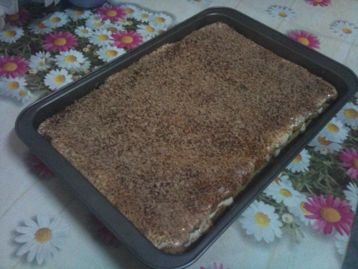 Se amesteca cu mixerul galbenusurile in care adaugam treptat zaharul,pana se fac spuma.Pe urma mascarpone si albusul spuma,iar la final lichiorul. Piscoturile le introducem in cafea si le punem in tava, peste ele adaugam jumatate din crema,mai punem un rand de piscoturi, restul de crema si se orneaza cu cacao si cu ciocolata rasa.