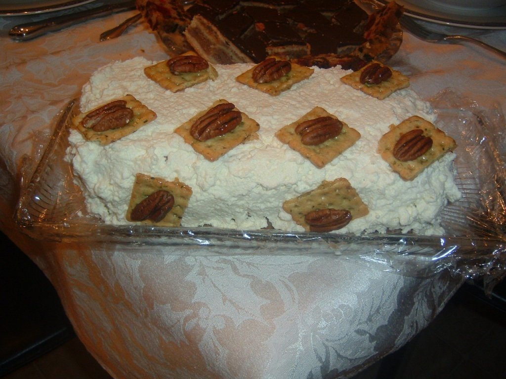 Inainte de-a scoate tortul din frigider,batem frisca.Se scoate tortul din frigider si cu grija ,tinand folia alimentara de capete,scoatem tortul din tava si-l asezam pe un platou.Se indeparteaza folia si se acopera pe lateral si deasupra cu frisca.Se poate decora cu nuci sau pur si simplu cu praf de cacao.(Eu l-am decorat cu biscuiti pe care am pus cate o jumatate de nuca ,un varf de lingurita de miere si le-am pus la cuptor 3min;cat sa se topeasca mierea.Dupa ce biscuitii s-au racit i-am folosit la decorarea tortului).