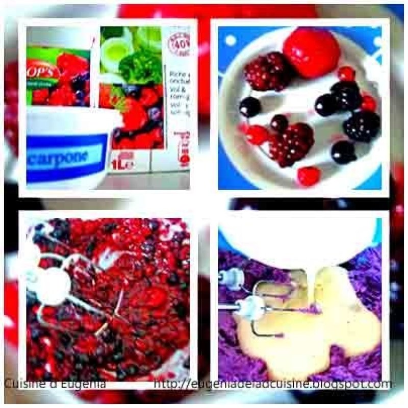 Se separă albuşurile de gălbenuşuri. Se bat albuşurile cu îndulcitor (după gustul fiecăruia), pâna ajung la consistenţa bezelei. Separat se bat gălbenuşurile cu o linguriţă de îndulcitor, până când compoziţia se albeşte (de consistenţa unei maioneze). Fructele de pădure se scurg bine de zeama care se păstrează pentru a înmuia pişcoturile, se aleg câteva pentru ornament), se mixează, brânza mascarpone se mixează şi ea separat. Se adaugă încet albuşurile peste gălbenuşuri, apoi branza mascarpone, fructele de pădure şi se mixează. La sfârşit se adaugă frişca lichidă şi se continuă mixarea la putere maximă pănă când compoziţia devine compact (la nevoie, se poate adăuga şi o folie de gelatină dizolvată în prealabil). Insa, dacă fructele sunt bine scurse de zeamă, nu este nevoie de gelatină). În sucul de la fructele de pădure se adaugă vişinata sau lichiorul sau esenţa de migdale, se rup câte 4 pişcoturi pentru fiecare cupă de tiramisu, se rup în două, se înmoaie puţin de tot în sucul cu vişinată, se aşează pe fundul cupei peste care se adaugă cremă, iar un rând de pişcoturi şi se încheie cu cremă. Se ornează şi se dau la frigider pentru 6-7 ore.