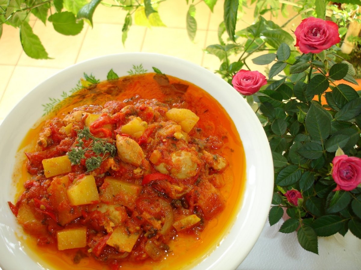 Sosul il pregatim in ceaun, se incinge uleiul si se calesc rosiile taiate potrivit impreuna cu sare, piper, busuioc si cimbru iar spre sfarsit adaugam curry si boia. Se lasa sa fiarba si sa mai scada si cand sosul a devenit mai gros se da deoparte. Ceaunul se goleste, se spala si se caleste ceapa tocata si usturoiul apoi morcovul ras fin, ardeiul fasii, cartofii cubulete si dupa ce s-au calit bine se adauga carnea. Dupa ce si-a schimbat culoarea se adauga sosul de rosii, condimentele, o parte din verdeturi tocate si spre safrsit daca doriti si pasta de tomate. Se da la cuptor si cand e gata se serveste cu multa verdeata. Eu am facut-o de nenumarate ori ba chiar si cu vita si pui. Secretul este sa nu o gatiti cu apa ci sa-i puneti doar rosii. Reteta am facut-o la 1/2 cantitati.