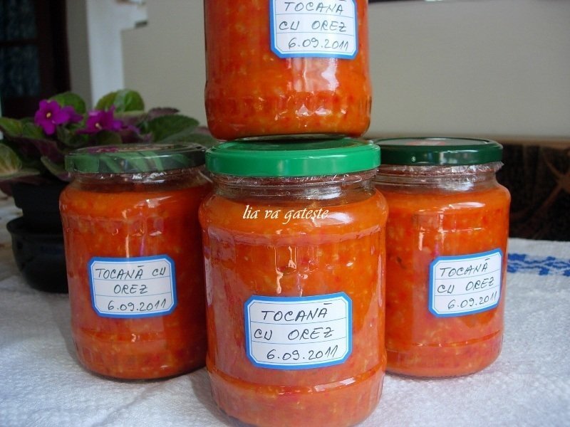 Turnam tocana fierbinte in borcane, le inchidem si le fierbem in bain-marie sau le punem in cuptor pentru 15’. Le lasam sa se raceasca complet, apoi igienizam, etichetam si depozitam borcanele in camara.
