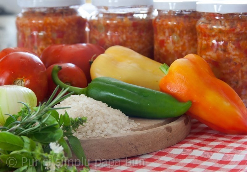 Când legumele au scăzut (o treime din cantitatea inițială) am presărat verdeața tocată și am pus orezul, zahărul, sarea și piperul. Se mai lasă la fiert câteva minute, amestecând continuu. În rețeta originală la final se adăuga conservantul, se omogeniza și se turna în borcanele încălzite. Eu am preferat să pun tocana în borcanele încălzite și apoi să presar în fiecare câte puțină aspirină pisată. Am închis borcanele și le-am pus într-un culcuș făcut dintr-o pătură până s-au răcit.