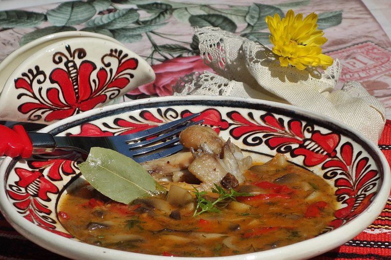 Se spala bine aripioarele si se pun la fiert, acoperite de apa, cu un praf de sare. Se spumeaza dupa primele clocote, apoi se adauga ciupercile curatate si feliate. Cand aripioarele au fiert, se scot din supa si se rumenesc bine in ulei. Se scot pe o farfurioara si in acelasi ulei se caleste ceapa taiata marunt si ardeiul feliat mic. Se lasa sa se caleasca un pic, pana incep sa aibe o stralucire, apoi se adauga rosiile date prin razatoarea mica, dupa ce le-a fost indepartata pielita. Se lasa sa scada bine sucul lasat si cand incep sa se inmoaie bine ardeiul si ceapa, se adauga si lingurita de pasata de tomate, se amesteca pana se omogenizeaza bine si se adauga si lingura de faina. Se amesteca bine si se dilueaza cu supa. Se lasa sa devina un amestec omogen, apoi se toarna in supa cu iuperci, se lasa sa clocoteasca bine amestecand in continuu, se potriveste de sare si piper, se adauga aripioarele rumenite, foile de dafin si se opreste focul. Se presara deasupra verdeata tocata fin.