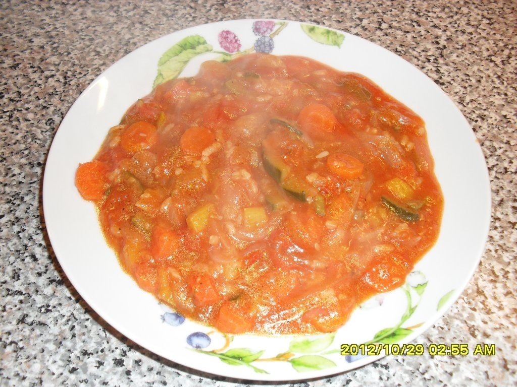 Luam legumele si le curatam de coji, cotoara si seminte. Le spalam bine si le tocam in mod grosolan, adica ceapa, rosiile si zuchinele in felii mari; morcovul si radacina de patrunjel in rondele; ardeiul gras si pastranacul in cuburi mai mari. Intr-o cratita punem uleiul la incins, cind incepe sa se incinga punem si radacinoasele si lasam sa se friga putin, circa 2-3 minute dupa care adaugam sucul de rosii si circa 200ml de apa, acoperim cu un capac si lasam sa fiarba circa 10 minute la foc potrivit mestecind din cind in cind sa nu se prinda de fundul cratitei. Dupa care adaugam restul legumelor, amestecam bine, acoperim din nou si lasam sa fiarba la foc potrivit, amestecind frecvent, pina cind legumele incep sa se inmoaie, atunci adaugam orezul si cubuletul Knor, dizolvat in prealabil in putina apa fierbinte, amestecam bine si lasam sa fiarba pina cind toate legumele sunt bine fierte.Tot acest timp este nevoie sa amestecam destul de des ca altfel incepe sa se prinda de fundul cratitei. Cind totul este fiert, potrivim de sare si piper, mai lasam sa dea un clocot si mincarea este gata. Pentru cei care le place picant, pot adauga si un ardei iute mai mic, taiat rondelute mici. Poate fi servita ca atare ca si mincare de post (calda sau rece) sau ca si garnitura. Pofta buna!