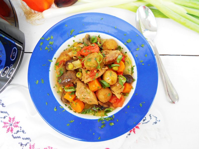 Am tăiat toate legumele grosier și le-am așezat în vasul ceramic Crock Pot. Cartofii i-am gătit în coajă.