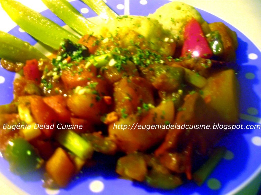 se taie carnea in bucati potrivite si se prajeste putin in uleiul bine incins. Se stinge cu pasta de tomate si apa si se lasa sa fiarba la foc potrivit. Cand carnea este aproape fiarta, se adauga cartofii taiati in cuburi mici, morcovul taiat rondele, ceapa taiata julien si tijele de telina taiate rondele nu prea mici. Dupa cca 10 minute se adauga ardeiul gras taiat cuburi sau julien. Dupa 3 minute se adauga dovlecelul taiat cuburi potrivite. Se adauga vinul sau otetul se lasa sa dea intr-un clocot, se sareaza si se pipereaza, se adauga usturoiul taiat felii, rosiile cherry si se da la cuptor 10 minute pentru gratinare. Se serveste fierbinte cu patrunjel verde fin tocat, cu garnitura de galuste din gris si faina sau orez sau paste.