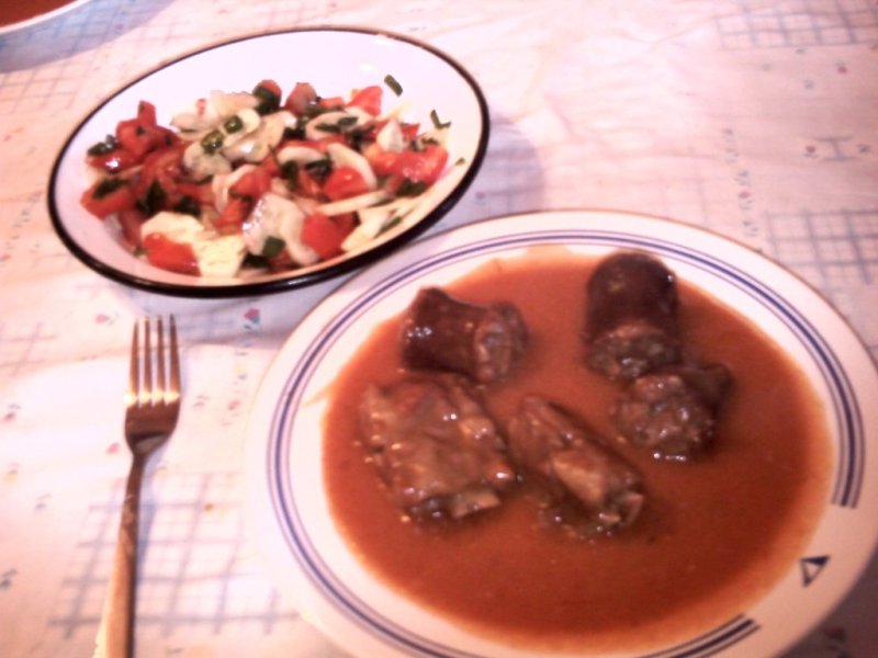 Se fierbe carnea cam o ora.In ulei se prajeste faina care se stinge cu zeama de pe carne.Se adauga toata sticla de bulion si se mai fierbe pana se ingroasa putin tocanita.Se drege cu sare si piper.E o reteta foarte simpla dar grozav de gustoasa si are o aroma deosebita mai ales acum vara.Si merge grozav cu o salata de legume proaspete din gradina.