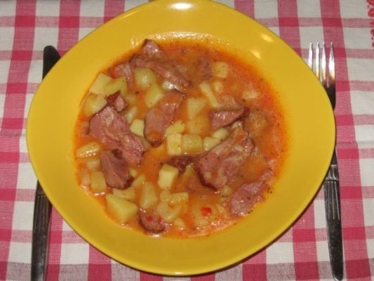 Se taie felii ardeii si ceapa, iar usturoiul se toaca nu foarte marunt. Acestea se pun la prajit intr-o tigaie in care am pus 3 linguri de ulei. Se feliaza sunca, si se adauga peste legume. Se continua prajirea inca cca 30 min., iar cind incepe sa se prinda, se adauga un pahar de vin alb, apoi cite o lingura de apa daca este necesar. Cind ceafa de porc este fiarta, se muta toata compozitia intr-o cratita, se adauga cartofii taiati cubulete, apoi o lingura de faina, si o lingurita de boia. Se amesteca bine, apoi se adauga cele 2 cani de apa, si se fierbe tocanita cca 30-40 min. Se pune o lingura de vegeta, se potriveste de sare, piper, apoi se presara maghiran, cimbru si frunze de patrunjel verde.