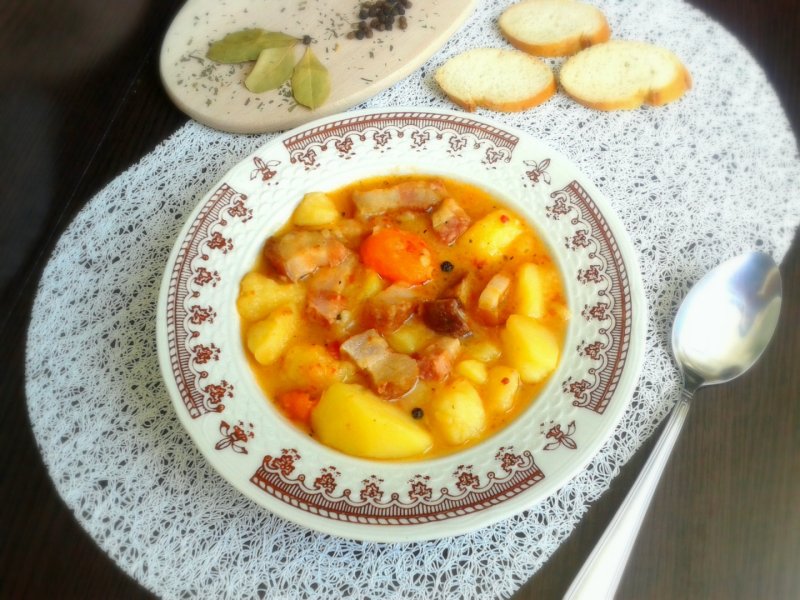 Cartofii se curata, se spala si se taie in bucati mari. Se pun in cratita dupa ce s-au inabusit legumele si carnea. Se pune apa cat sa acopere cartofii. Dupa ce se fierb se adauga rosiile, foaia de dafin, piperul si ierburile aromatice. Se mai da in cateva clocote, apoi se ia cratita de pe foc.