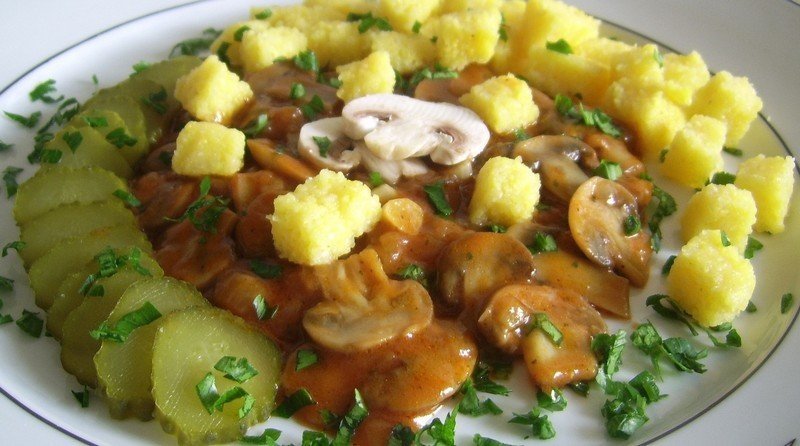 Ceapa tocata marunt se inabusa in 3 linguri ulei si 3 linguri apa; cand s-a inmuiat se adauga ciupercile taiate felii. Dupa 2-3 minute se adauga usturoiul si apa amestecata cu sucul de rosii si amidonul.