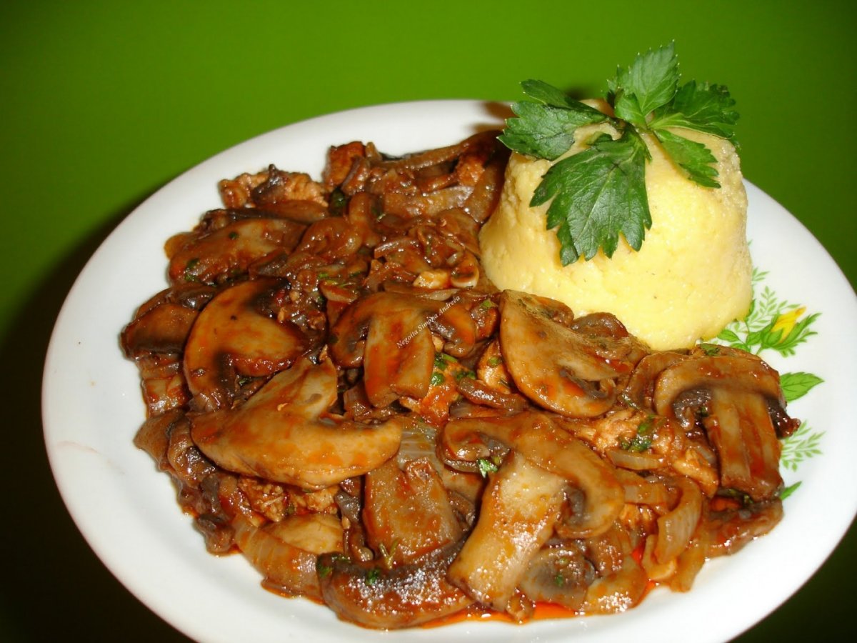 Pieptul de curcan se spala si se sterge bine. Se condimenteaza putin si se taie fasii sau cubulete. Ceapa si usturoiul se curata si se taie rondele. Pieptul se pune la calit in cateva linguri de ulei si apoi se adauga si ceapa impreuna cu usturoiul si se mai calesc impreuna. Se spala ciupercile si se taie felii. Se adauga peste pui 1/2 din cantitatea de ciuperci si se calesc. Se adauga cateva linguri de apa fiarta pentru a nu se arde. Se adauga si a doua parte de ciuperci si se calesc si ele. Rosiile se oparesc si se decojesc iar apoi se zdrobesc cu blenderul adaugandu-se la ciuperci. Eu am folosit bulion concentrat. Se da la cuptorul incalzit sa scada putin. Apa nu se adauga decat putina la inceput pentru a se inabusi legumele astfel iese mai gustoasa pentru ca ciupercile isi lasa zeama. Am preparat o mamaliga din jumatate pachet de malai mic unguresc si am pus in cateva boluri clatite cu apa rece sau unse cu ulei. Cand se mai raceste mamaliga se rastoarna pe farfurii. Se serveste cu patrunjel verde.
