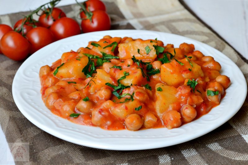 Adaugam nautul si cartofii taiati cuburi. Eu am folosit naut din conserva pe care doar l-am scurs, daca folositi naut proaspat il veti lasa peste noapte la inmuiat in apa.