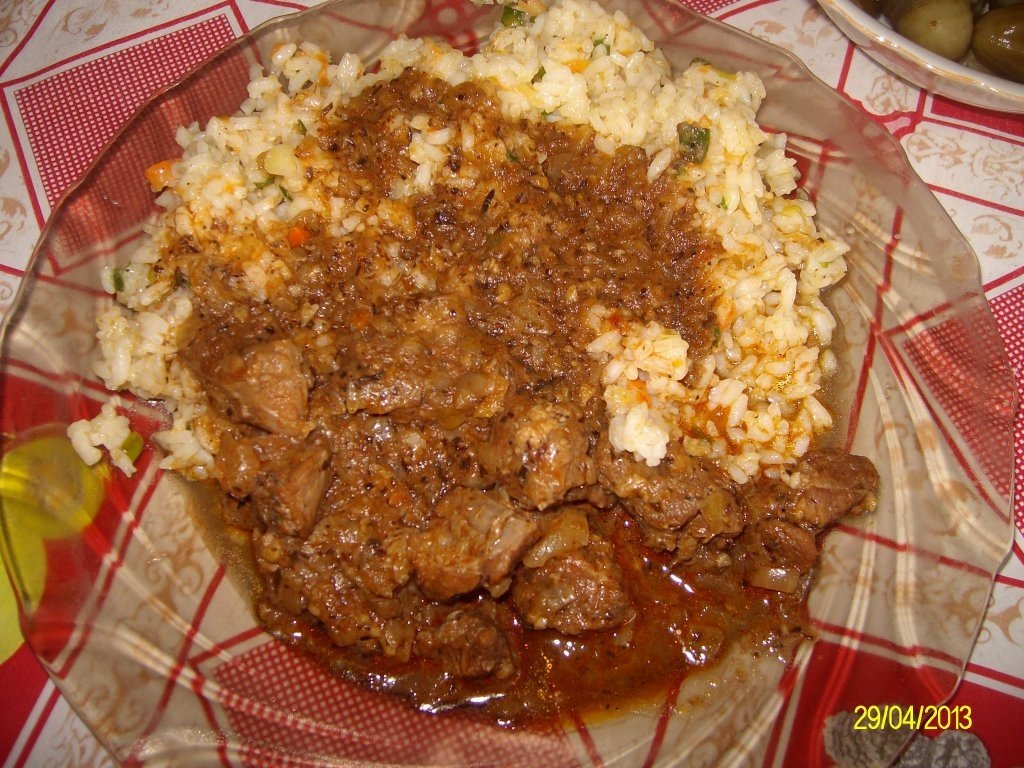 Dupa vreo 5 min adaugam carnea taiata bucati,condimentele,si vinul si lasam 5 min dupa care adaugam apa si lasam sa fiarba vreo 2-2 ore si jumatate pana scade apa si se formeaza sos.