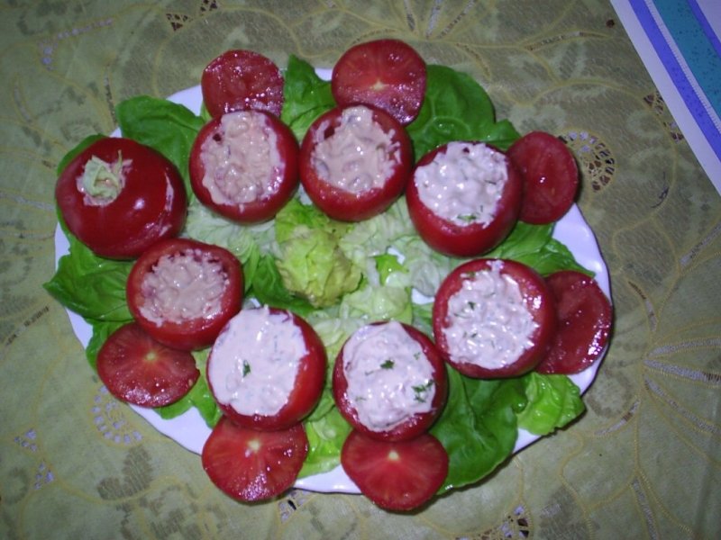 Se taie fundul la rosii si se scoate miezul,curatind cit mai bine de zeama rosiei.Intre timp se prepara sosul amestecind cele 4 componente si daca preferati si brinza eu am incercat, dar e mai bine intii gustul original si apoi experimente.Se pune sosul peste creveti si se umplu rosiile asezindule pe un platou si dindule la rece pt o ora inainte de servire.E o mincare foarte refrescanta in zilele calduroase de vara atunci cind nu poti sa pui sa fierbi un ou.