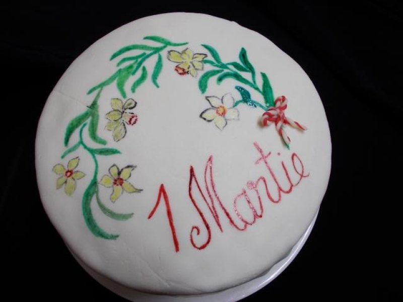 Gelatina hidratata se topeste, se adauga mierea, margarina si zaharul pudra si se amesteca. Pasta obtinuta trebuie sa fie elastica si usor de modelat, ca o plastilina. Se intinde apoi intre doua folii alimentare, se da la o parte folia de deasupra si cu ajutorul foliei o punem peste tortul care a fost acoperit cu un strat subtire de gem de caise sau alt gem fin, fara fructe, pentru ca pasta de zahar sa se lipeasca de blat. Dupa ce am lipit pasta frumos peste tot, decupam plusul. Pentru decor de acesta data am desenat cateva narcise.