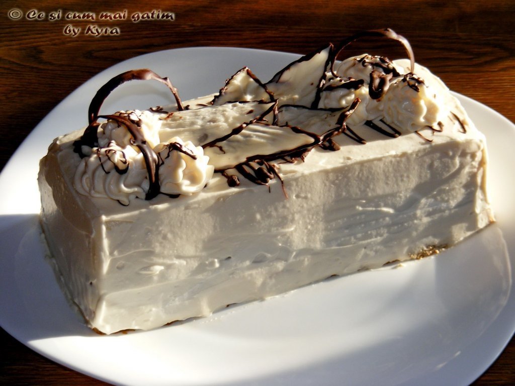 Se pune forma la rece pentru cel putin 24 de ore. Eu am lasat-o de pe o zi pe alta. Se indeparteaza folia alimentara apoi se aseaza un platou deasupra dupa care intoarcem prajitura. Se scoate cu grija folia si de pe partea prajiturii ce a stat in forma, urmind sa o decoram dupa cum dorim.
