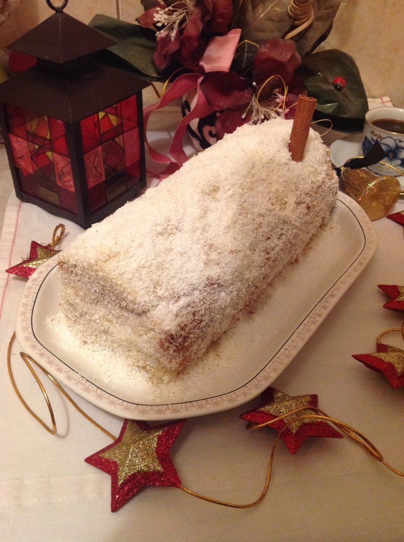 Din blatul racit se decupeaza un triunghi care va fi acoperisul cabanei. Partea ramasa se insiropeaza, se unge cu crema, se aseaza bananele, iar de o parte si de alta a acestora se pun piscoturi. Se umple cu crema si se aseaza ,,triunghiul,,decupat sub forma de acoperis. Se imbraca cu crema ramasa si se presara fulgi de cocos. Se infige un betisor de scortisoara sugerand cosul de fum