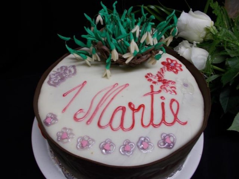 Pentru cosulet, am topit ciocolata neagra impreuna cu cea alba si pe un bol imbracat in folie de aluminiu si tinut in congelator cam o ora vom tuna ciocolata in fir. Lasam sa se raceasca si sa se intareasca ciocolata dupa care desprindem folia. Am fixat cosuletul pe tort, am aranjat apoi ghioceii pregatiti cu cateva ore mai inainte de pregatirea tortului.
