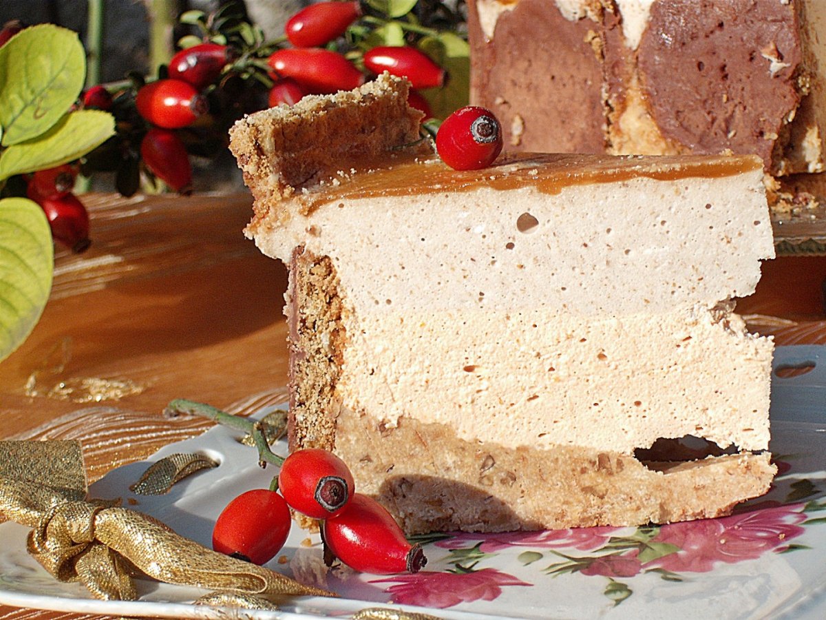 Se mixeaza iarasi frisca cu smantana si branza de vaci apoi se amesteca cu piureul de castane si cu gelatina topita la bain marin.Se toarna peste crema de macese si se da la rece cel putin 2 ore.