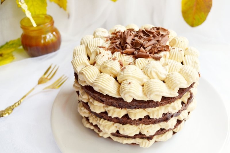 Pune o felie de blat pe un platou, insiropeaza felia, pune crema de caramel intr-un pos si spriteaza pe felie un strat de crema, iar pe margine mai spriteaza un rand,ca sa se inalte putin. Pune in mijloc 2 linguri de caramel,sfarama o rondea de orez expandat si pune-o deasupra caramelului, acopera apoi orezul expandat cu 3-4 linguri ganache de ciocolata, pune urmatoarea felie si continua insiropat, crema de caramel, caramel, orez expandat si ganache de ciocolata pana cand termini feliile. La final orneaza ultima felie cu crema de caramel si ciocolata razuita. Introduceti in frigider pana in momentul servirii.