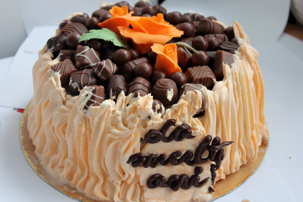 Scoatem tortul din frigider, indepartam inelul sau folia de pe margine, intindem cu o spatula crema de pe margini si turnam ciocolata doar pe partea superioara. Lasam cateva minute, apoi asezam deasupra pralinele, bomboanele si trandafirii din zahar.