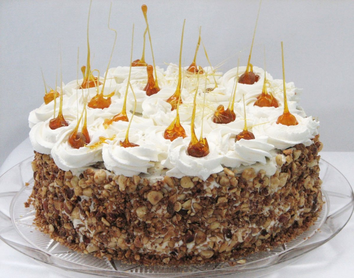 O foaie blat de ciocolata pe care o stropim cu jumatate din cantitatea de sirop, jumatate din crema de lapte, blatul de bezea, crema de ciocolata alba peste care presaram 4 linguri din crocantul de alune, a doua foaie de blat de ciocolata, la fel, insiropata; scoatem inelul si imbracam tortul cu un strat subtire de crema, iar pe margini aranjam crocantul cu ajutorul unei palete. Ornam deasupra cu trandafiri din crema de lapte ramasa si alune in zahar ars.