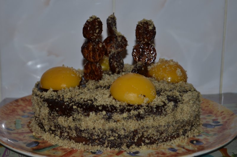 Se rupe ciocolata in bucati mici, se adauga untul si se pun pe foc mic, cand se topeste ciocolata, se toarna peste tort, se toarna si peste felii de banane care au fost asezate pe tort, se asaza bucati de piersici, nuca macinata si se da torul la frigider. Se poate servi a doua zi. Sa aveti pofta dragilor!